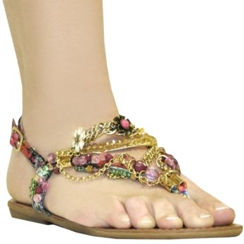 A sweet treat for your feet with this embellished flat sandal featuring stand-out beadwork décor with adorable floral accents, complementary chain-link detailing and adjustable ankle strap.